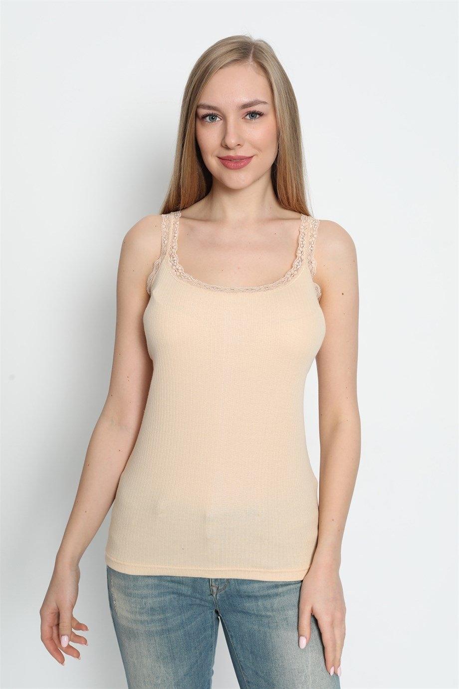 Ten rengi, ince askılı ve dantel detayına sahip pamuk ribana dikişli atlet. %100 Pamuk Ribana