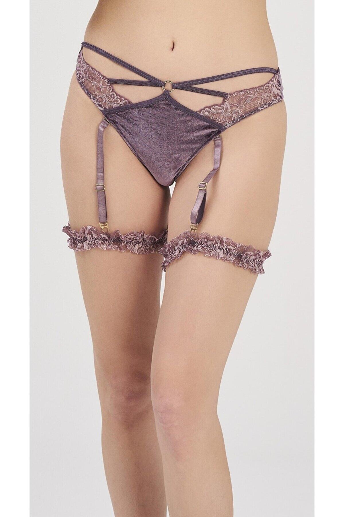 Gül kurusu tonlarında, kadife dokuya sahip jartiyer kemeri ve string külot seti.