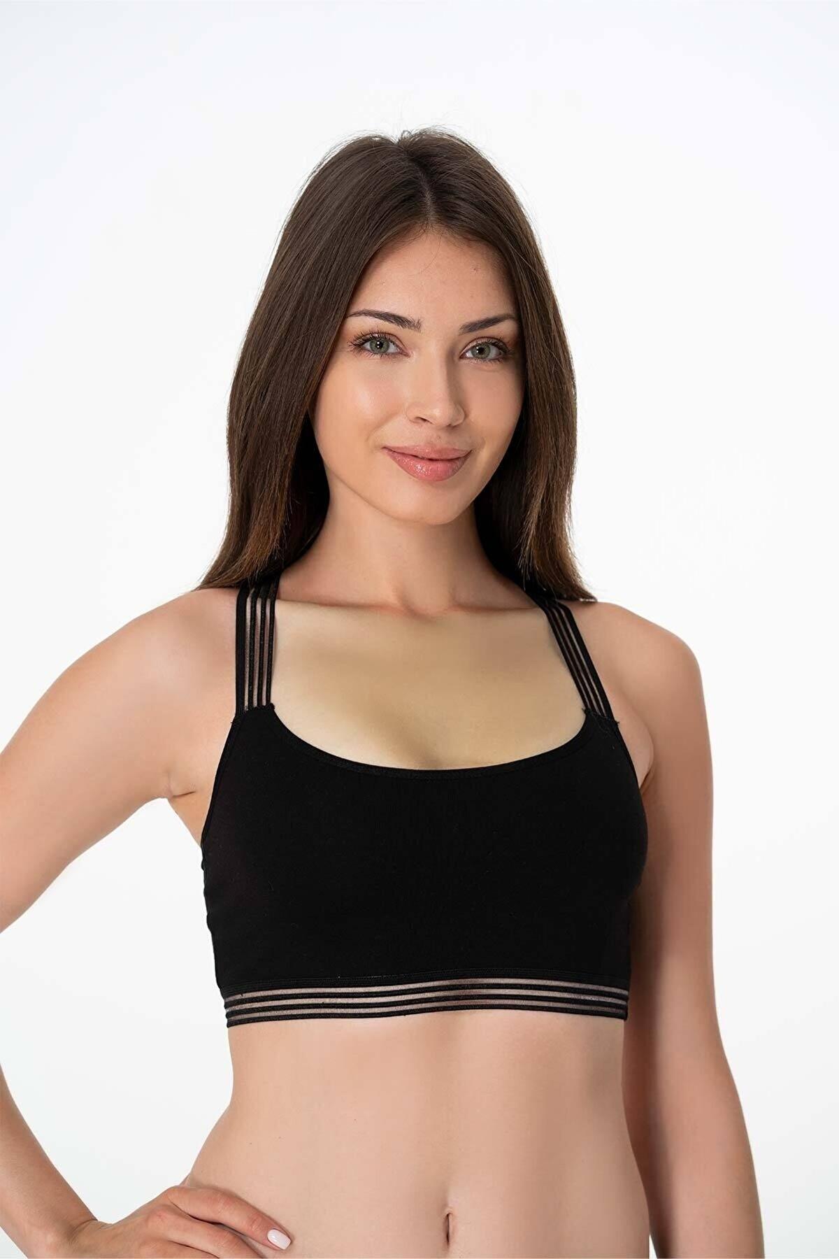 Siyah, modal kumaşlı, dantel detaylı büstiyer. Sırt çapraz kesim, dikişsiz yapıyla konfor sunar. %47 Modal, %47 Pamuk, %6 Elastan