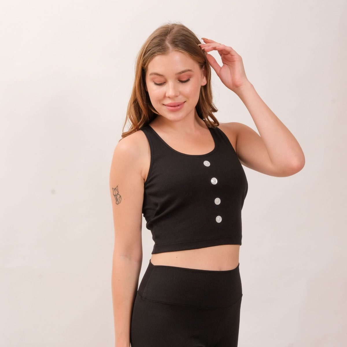Kalın askılı tasarımı ve ön sol tarafta asimetrik beyaz düğme sırası detayıyla pedli kadın crop top.