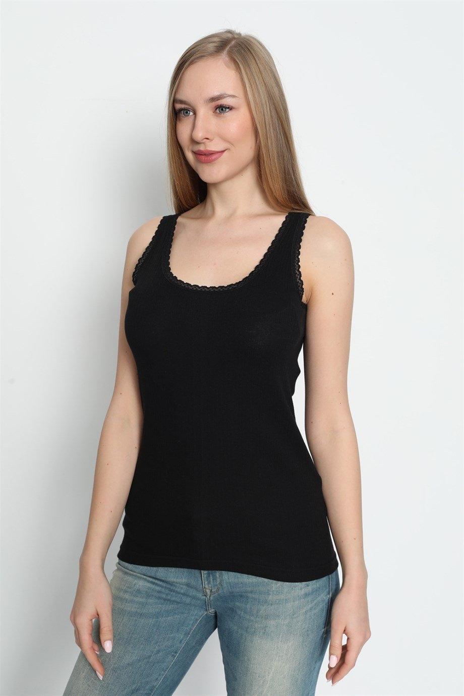 Siyah renginde, kalın askılı, dantelli detaylara sahip pamuk ribana atlet. Uzun boyu sayesinde pantolonlarla rahatça kombinleyebilirsiniz. %100 Pamuk Ribana