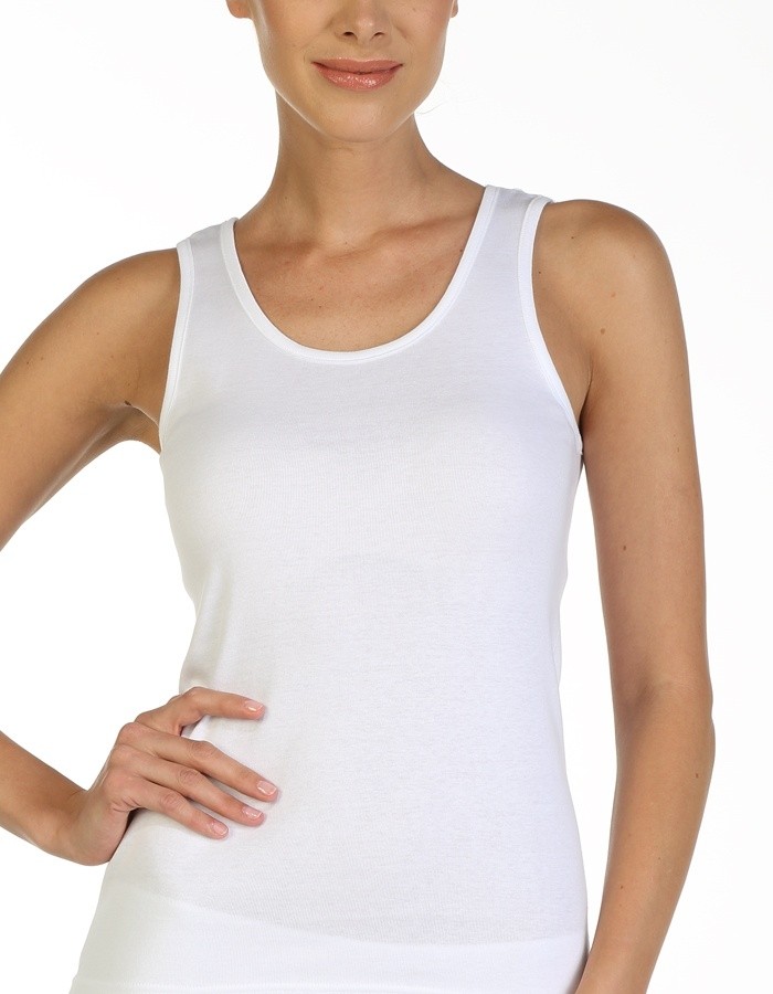 Beyaz renkte, kalın askılı, pamuklu ribana yapısıyla rahat bir atlet. %100 Pamuk