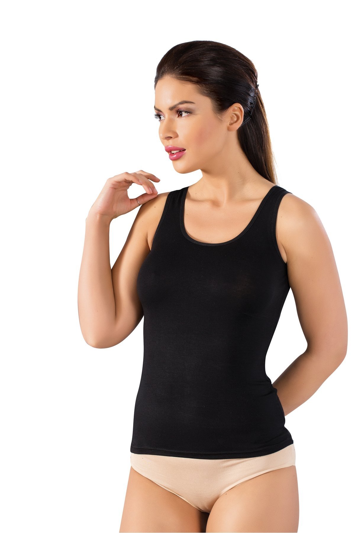 Siyah, beyaz ve ten renk seçenekleriyle sunulan bu kalın askılı atlet, pamuklu dokusuyla konfor sağlıyor. %100 Pamuk