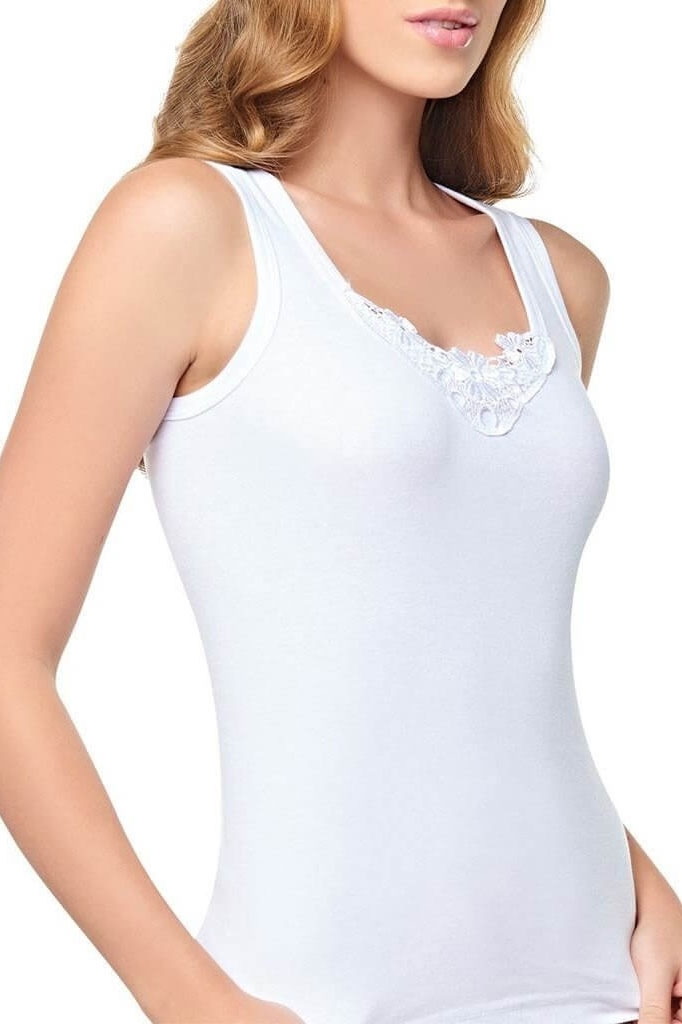 Beyaz renkte, kalın askılı ribana dantel detaylı atlet. Pamuklu kumaşı ile hem şık hem de rahattır. %100 Pamuk