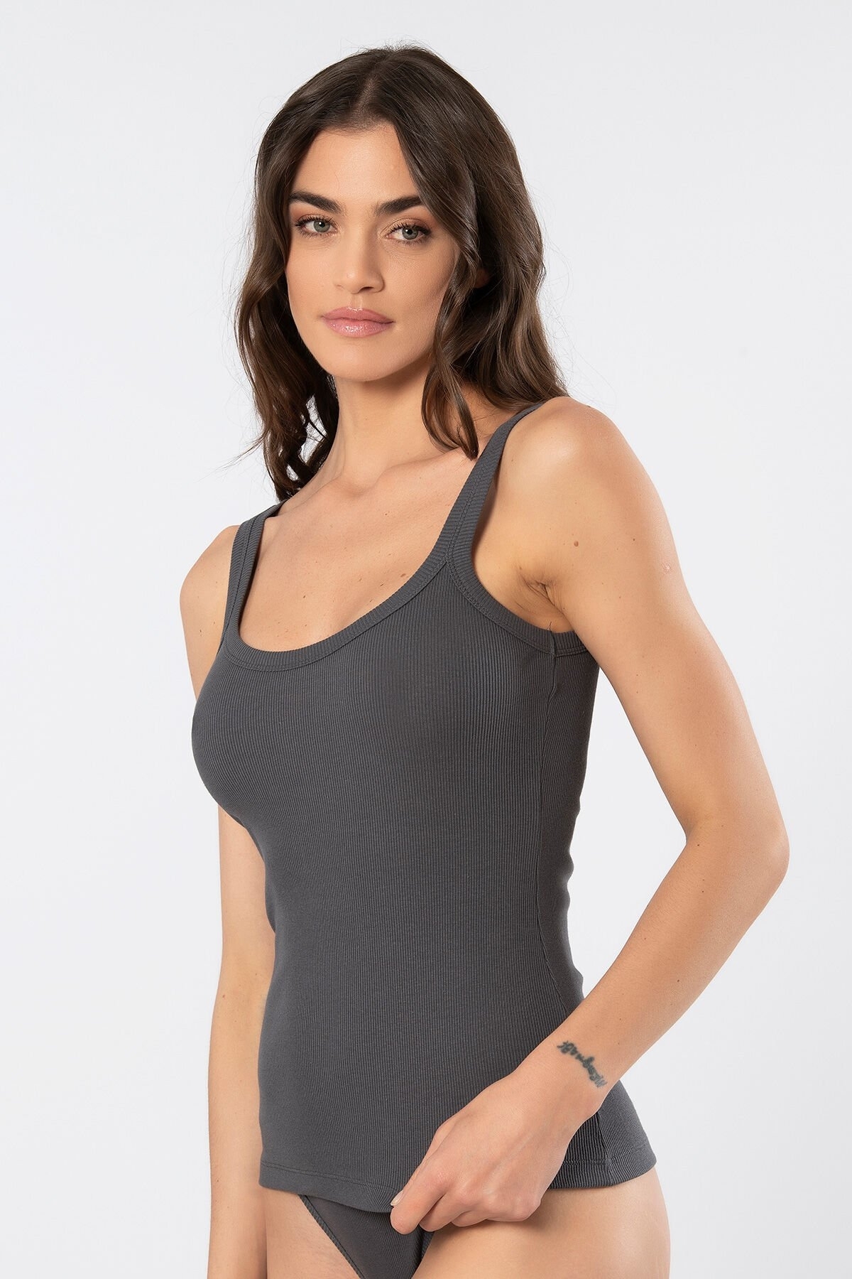 Kahverengi, kalın askılı ribana kesim kadın atlet, pamuklu yapısı ile gün boyu konfor sunar. %95 Pamuk, %5 Elastan