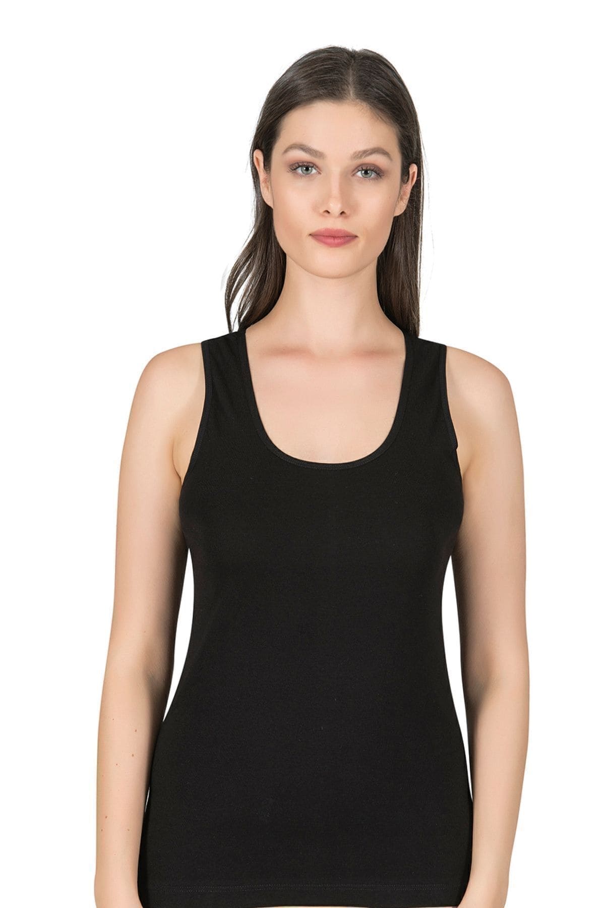 Siyah renginde, kalın askılı ve ribana dokusuyla rahat bir kadın atlet. %100 Cotton / Pamuk