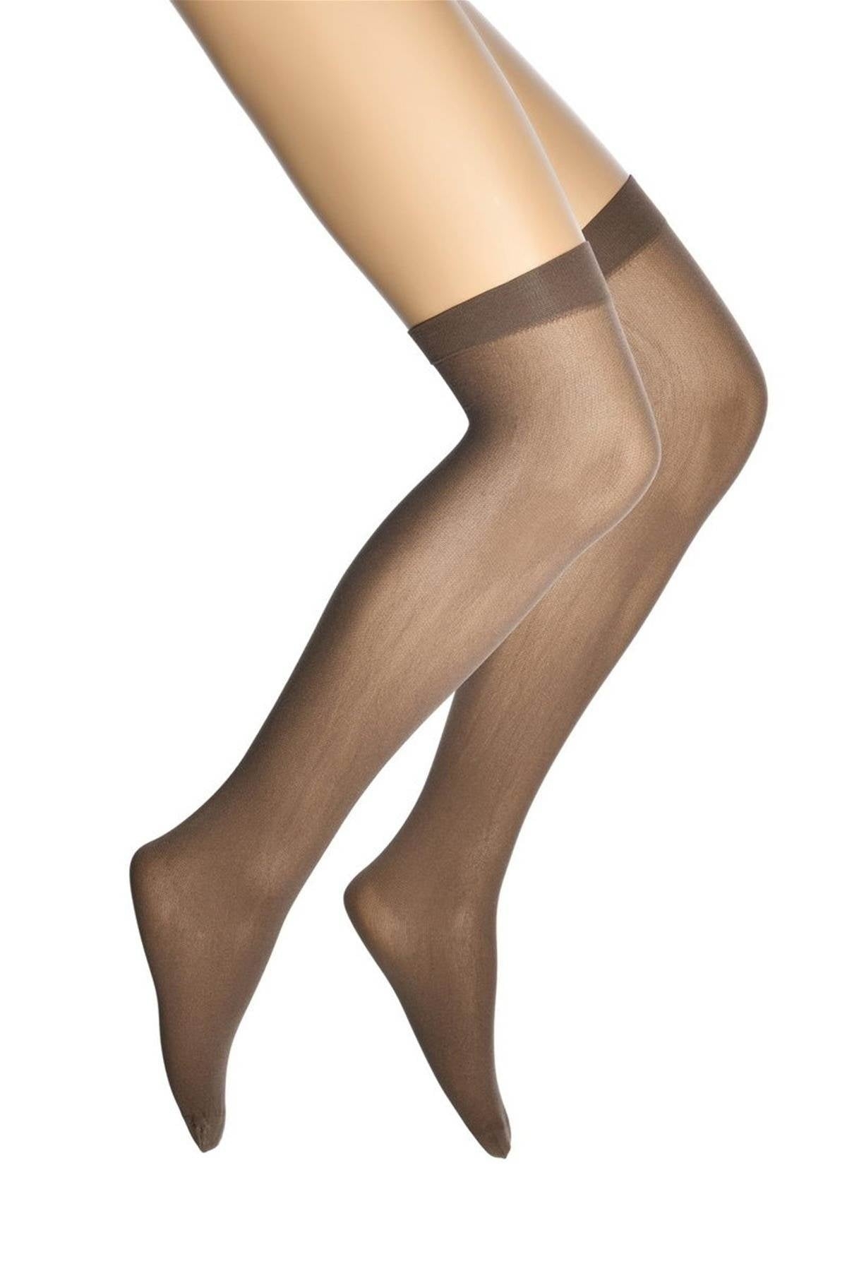 Koyu vizon tonlarında, lastikli ve burun takviyeli dizüstü kadın çorap, günlük kullanım için konfor sağlıyor.