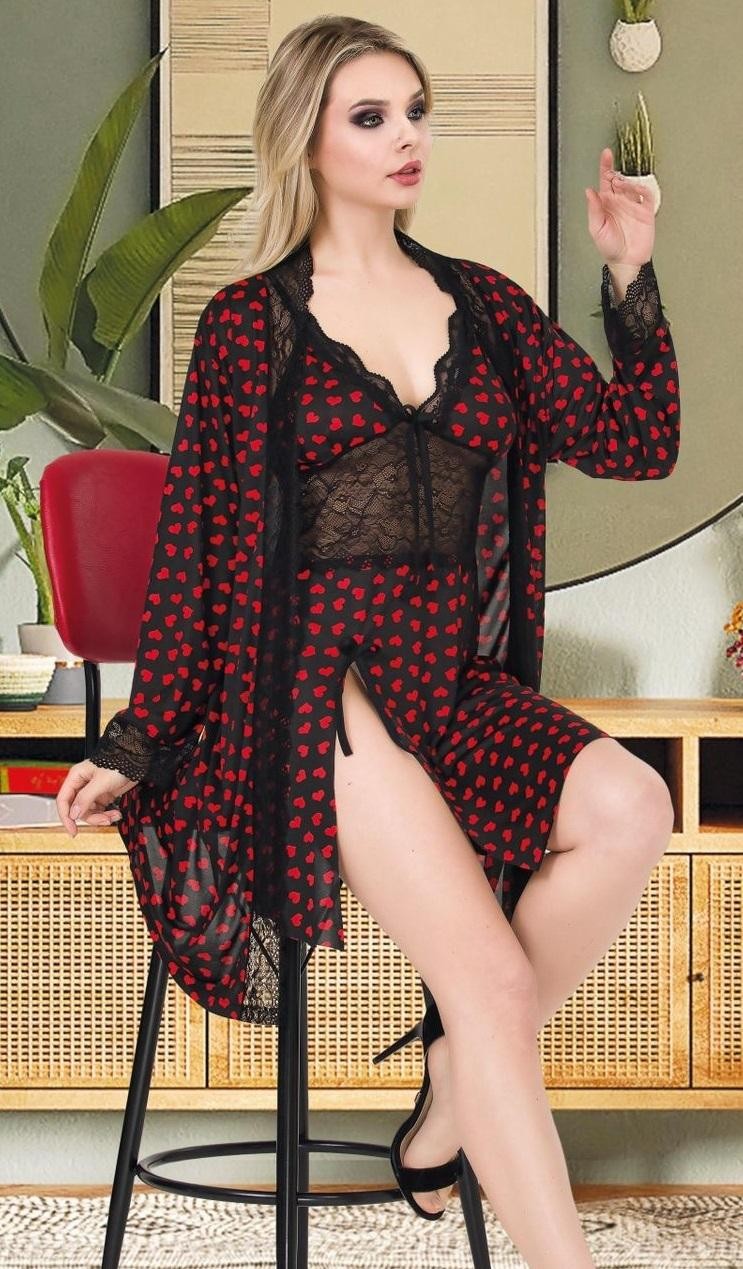 Kalp desenleri, kişisel bir tarz yaratmanıza yardımcı olurken, dantel detaylar da ürünün şıklığını artırıyor. Gecelik ve sabahlık takımı, şıklığı ve konforu bir arada arayanlar için mükemmel bir tercih. Hem kendinize hem de sevdiklerinize hediye olarak düşünebileceğiniz bu takım, romantiğin ve zarafetin simgesi olarak her kadının gardırobunda yerini alacak.