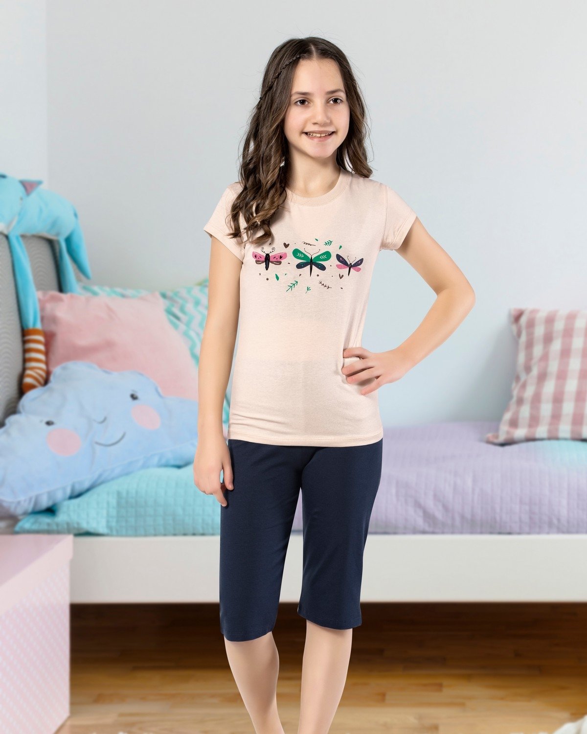 Kapri kesimi ve manşetli paçaları, bu takımın en önemli özelliklerinden biridir. Manşetler, pijamanın kaymasını önler ve çocukların hareket etmesine olanak tanır. Bu özellik, özellikle uyku sırasında kıpırtı yapan çocuklar için oldukça önemlidir. Evin içinde rahatça giyilebilecek bu takım, hem uyku zamanı hem de gündüz saatlerinde konfor arayan annelerin gözdesi olacak. Kız çocuklar için tasarlanan bu kapri takımı, hem şıklığı hem de fonksiyonelliği bir araya getiriyor.