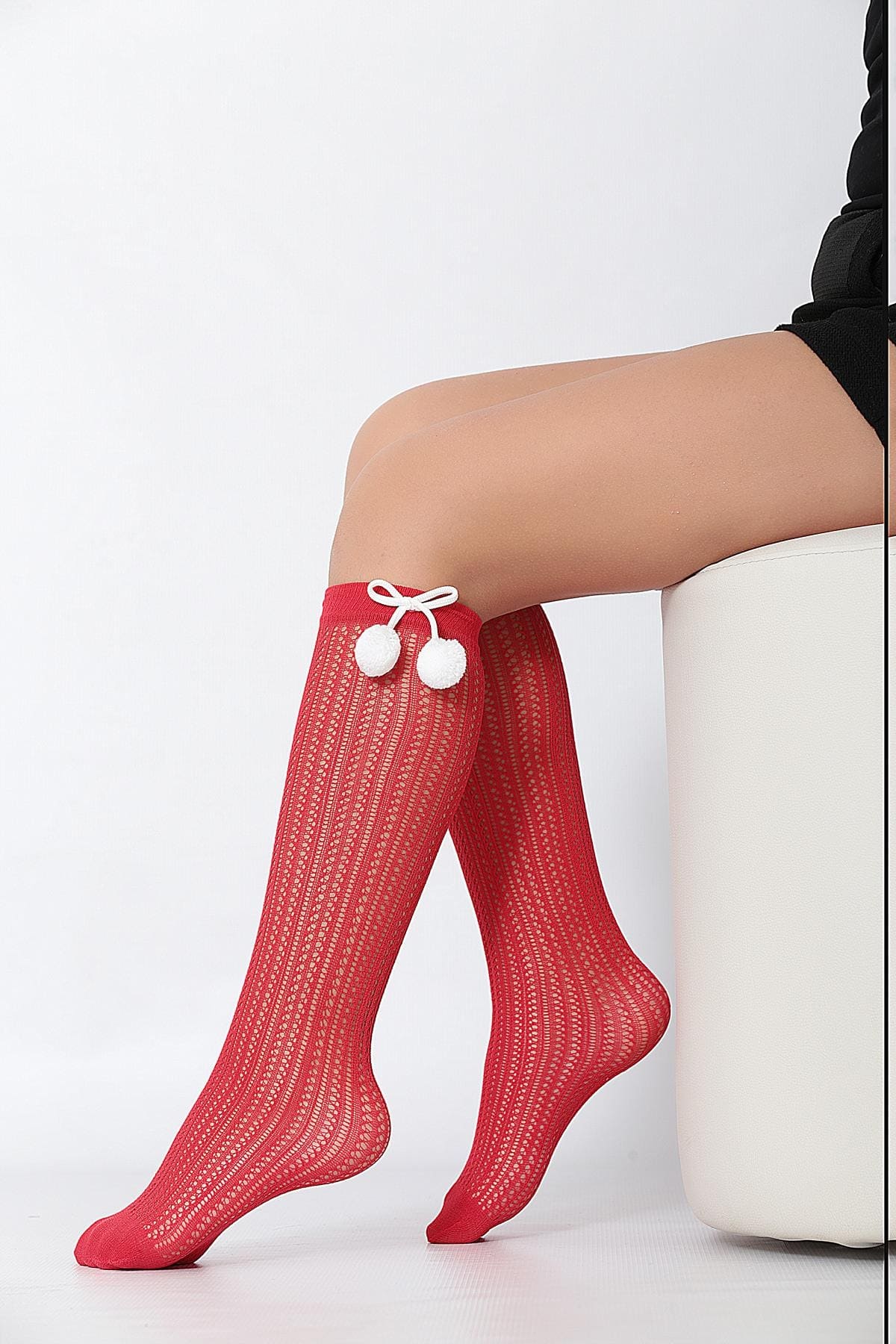 Kırmızı renkte, ponpon detaylı, file dokulu çocuk dizaltı çorabı. Yumuşak doku ve kaydırmaz taban ile tasarlanmıştır. %90 Polyamide, %10 Elastane