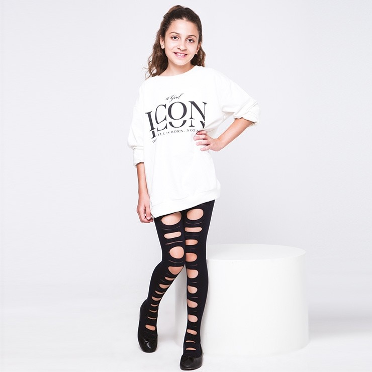 Siyah renkli, yırtık detaylı çocuk külotlu çorap. Esnek yapısı ve kaydırmaz tabanı ile rahat bir kullanım sunuyor. %91 polyamide, %9 elastane