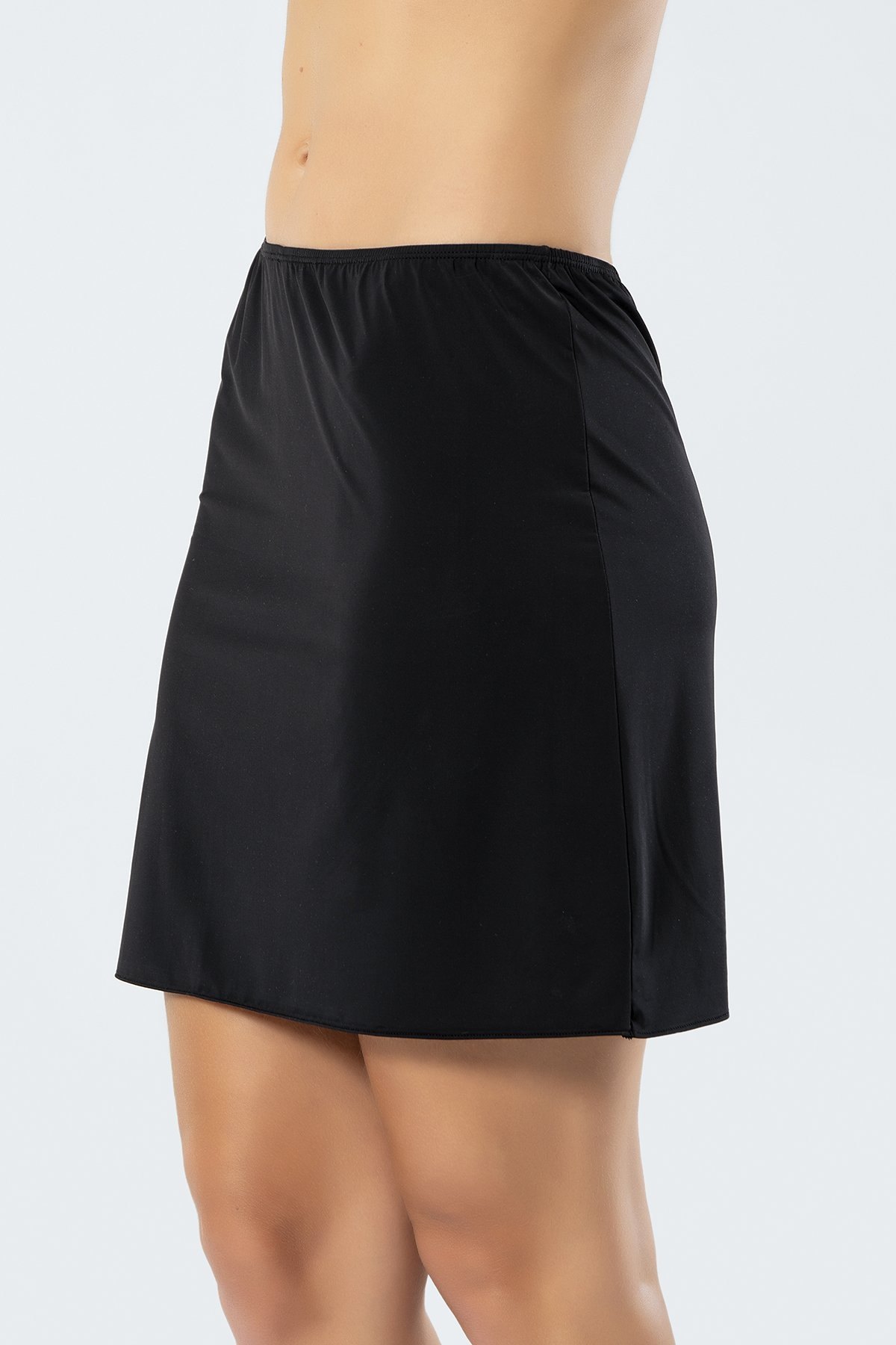 Siyah renkte, kaygan dokuya sahip jüpontur, ince bel lastiği ile rahat bir uyum sağlar.