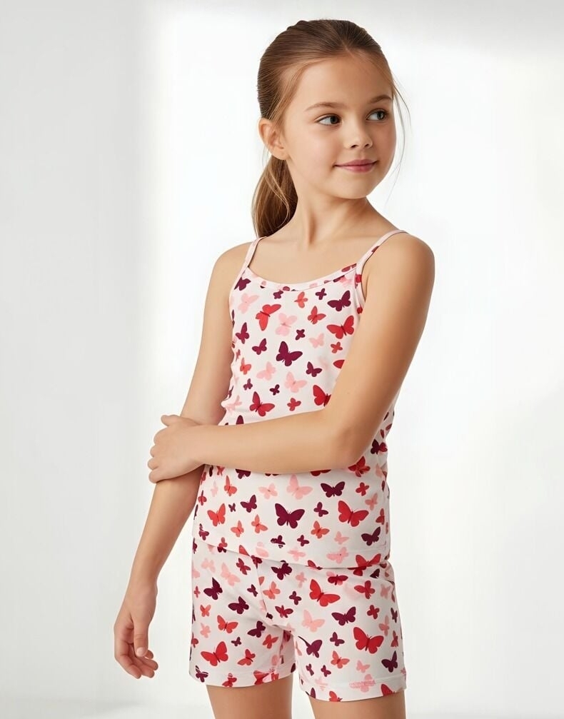 Pembe ve bordo tonlarında kelebek desenleriyle süslenmiş ince askılı atlet ve şort takımı, 2-10 yaş arası kız çocukları için tasarlanmış. İnce ip askıları hafif yapıda omuzda duruyor, yazlık kıyafetlerin altında görünmeden kalıyor. Farklı boyut ve tonlardaki kelebek figürleri desene hareket hissi katıyor.