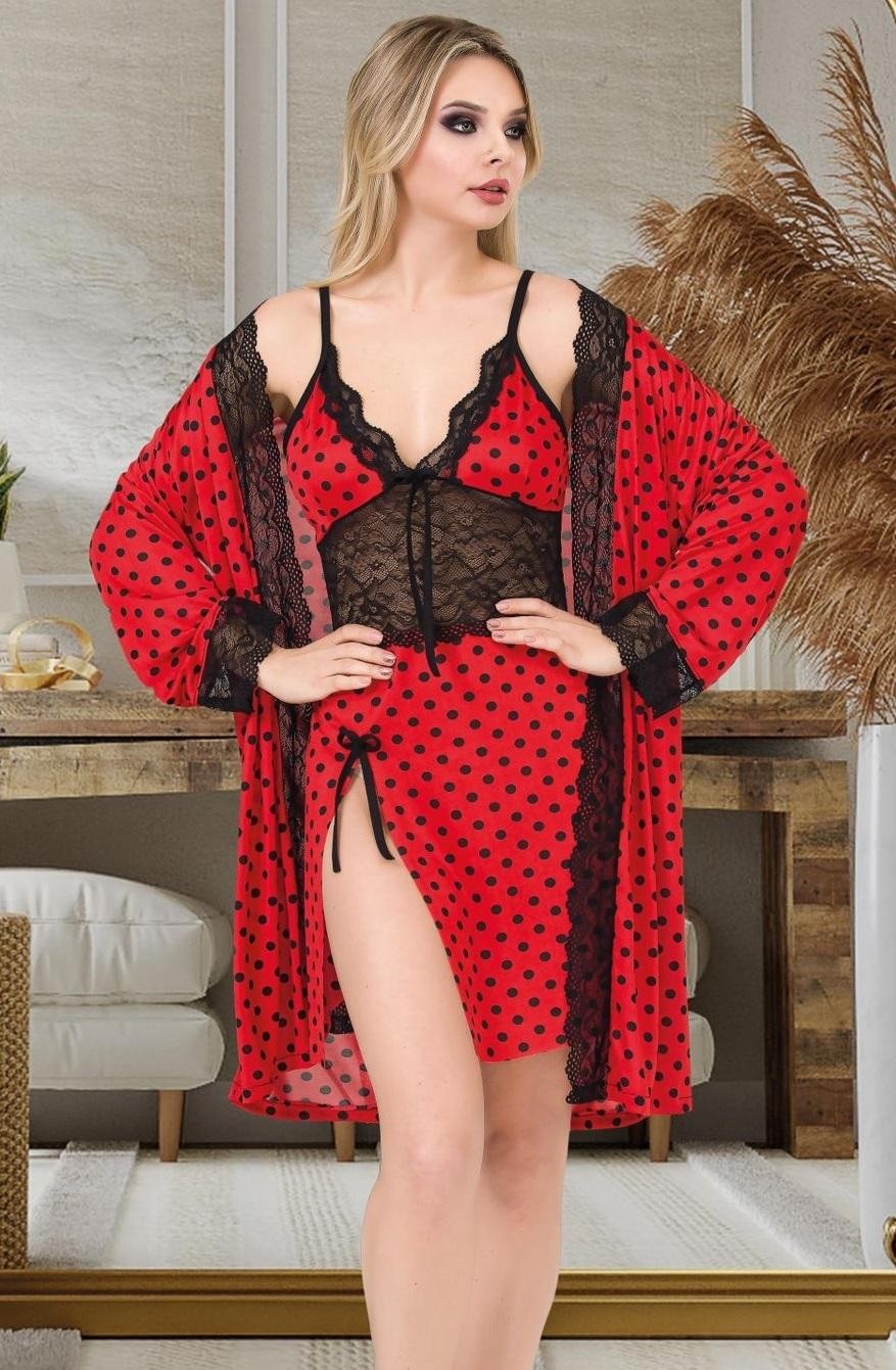 Kırmızı puantiyeli, dantel detaylı kısa gecelik sabahlık takımı, şık kesimiyle dikkat çekiyor.