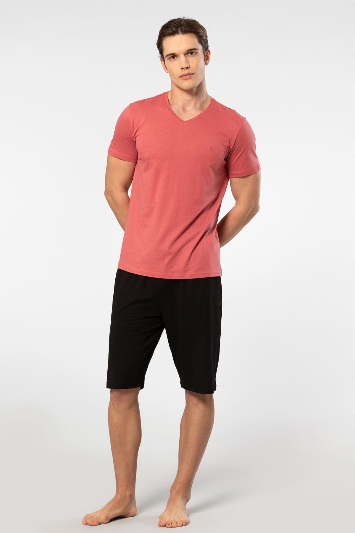 Bordo tonlarında, esnek ribana detaylı kısa kollu modal erkek pijama takımı. Rahat kesim ve iyi bir uyum sağlar. %50 Modal, %50 Pamuk