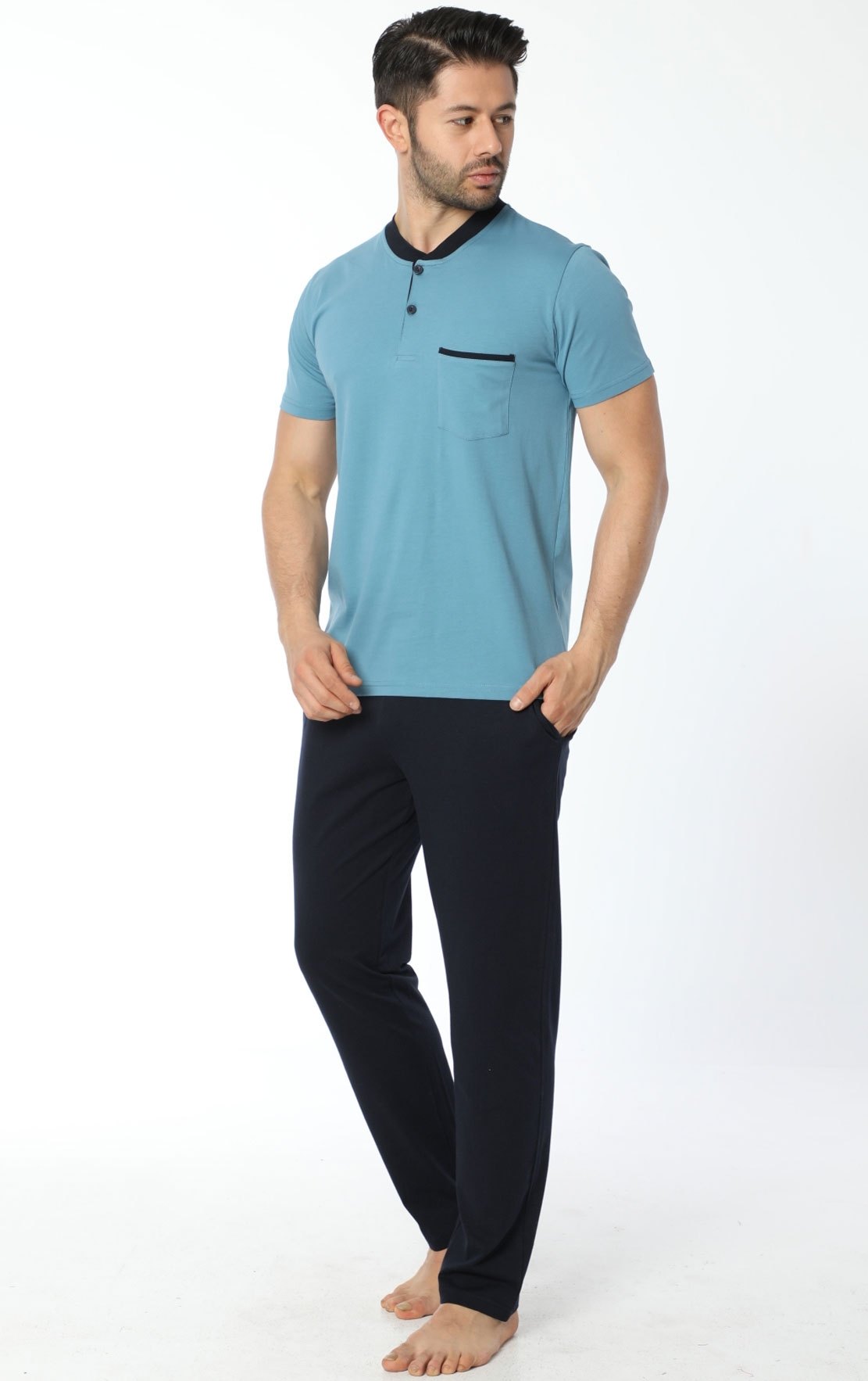 Turkuaz renkte, kısa kollu üst ve eşleşen pantolonla birlikte, hafif ve nefes alabilen bir pijama takımı.
