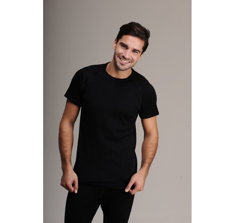 Siyah, kısa kollu termal fanila. Fırçalı iç yüzey ve esnek kumaş yapısıyla dikkat çekiyor.