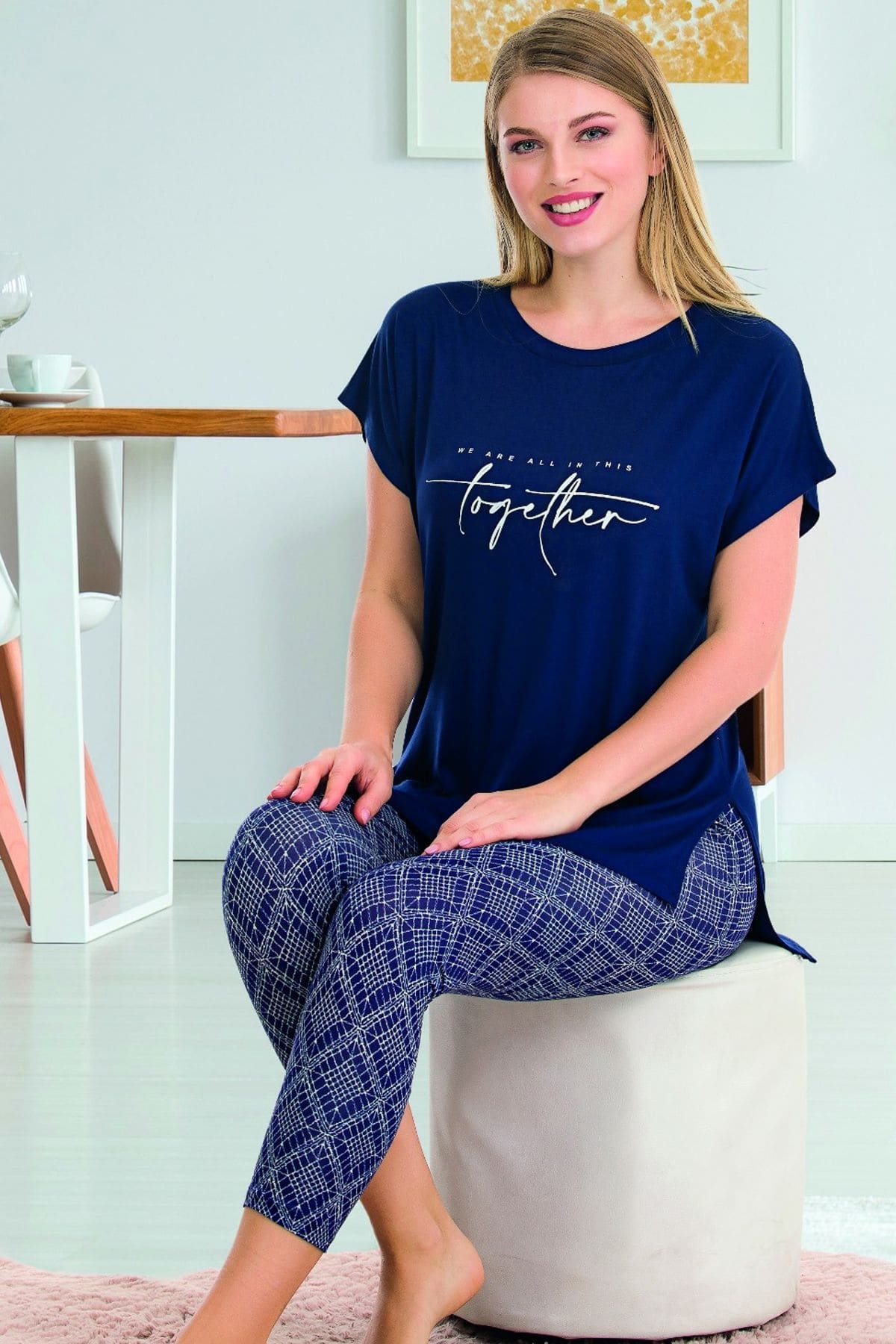 Lacivert tonlarda, yumuşak viskon kumaştan üretilmiş rahat kesim kapri pijama takımı.