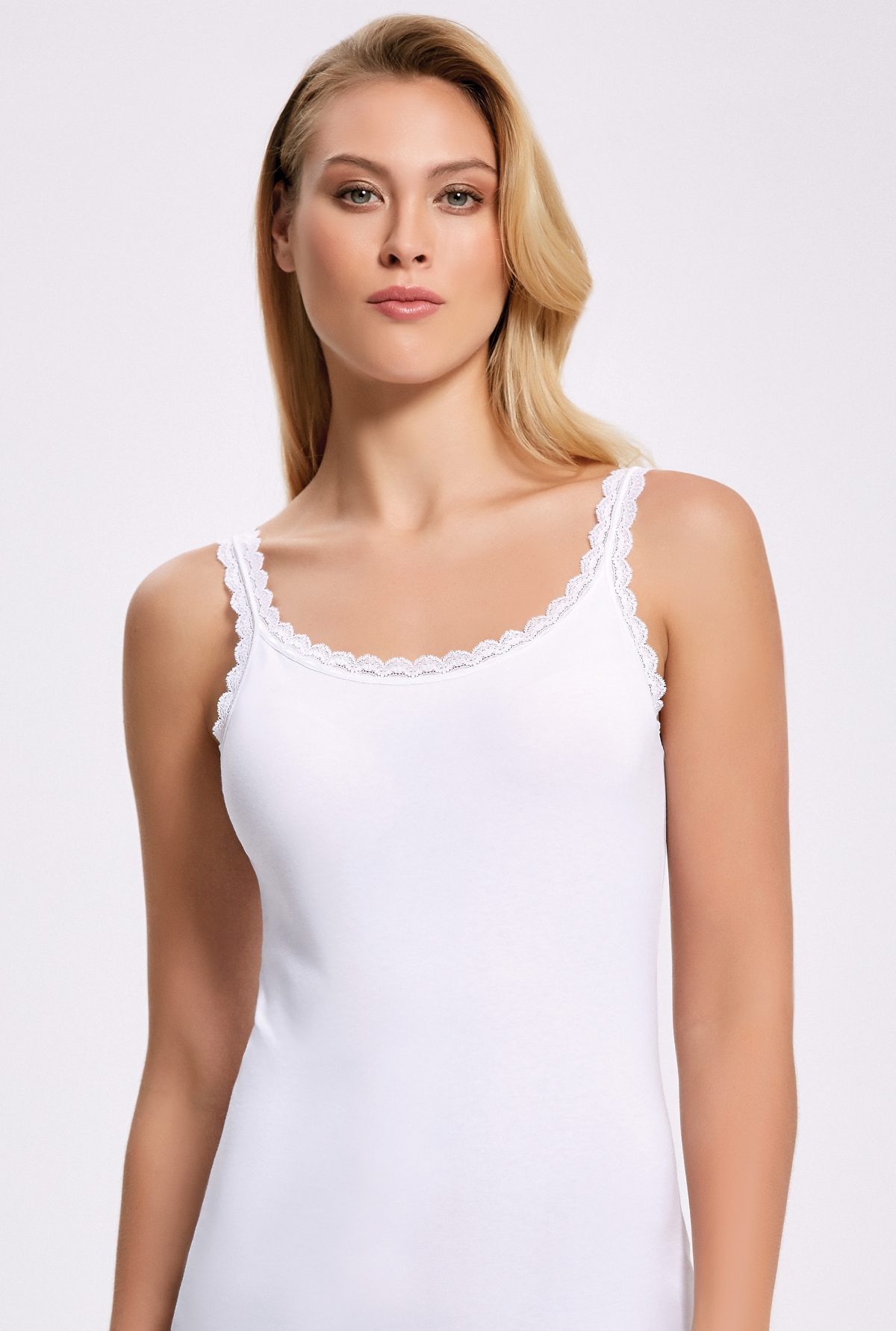 Beyaz tonlarında, dantel detaylı ve likralı askılı atlet, zarif bir görünüm sunuyor. %92 Pamuk , %8 Elastan