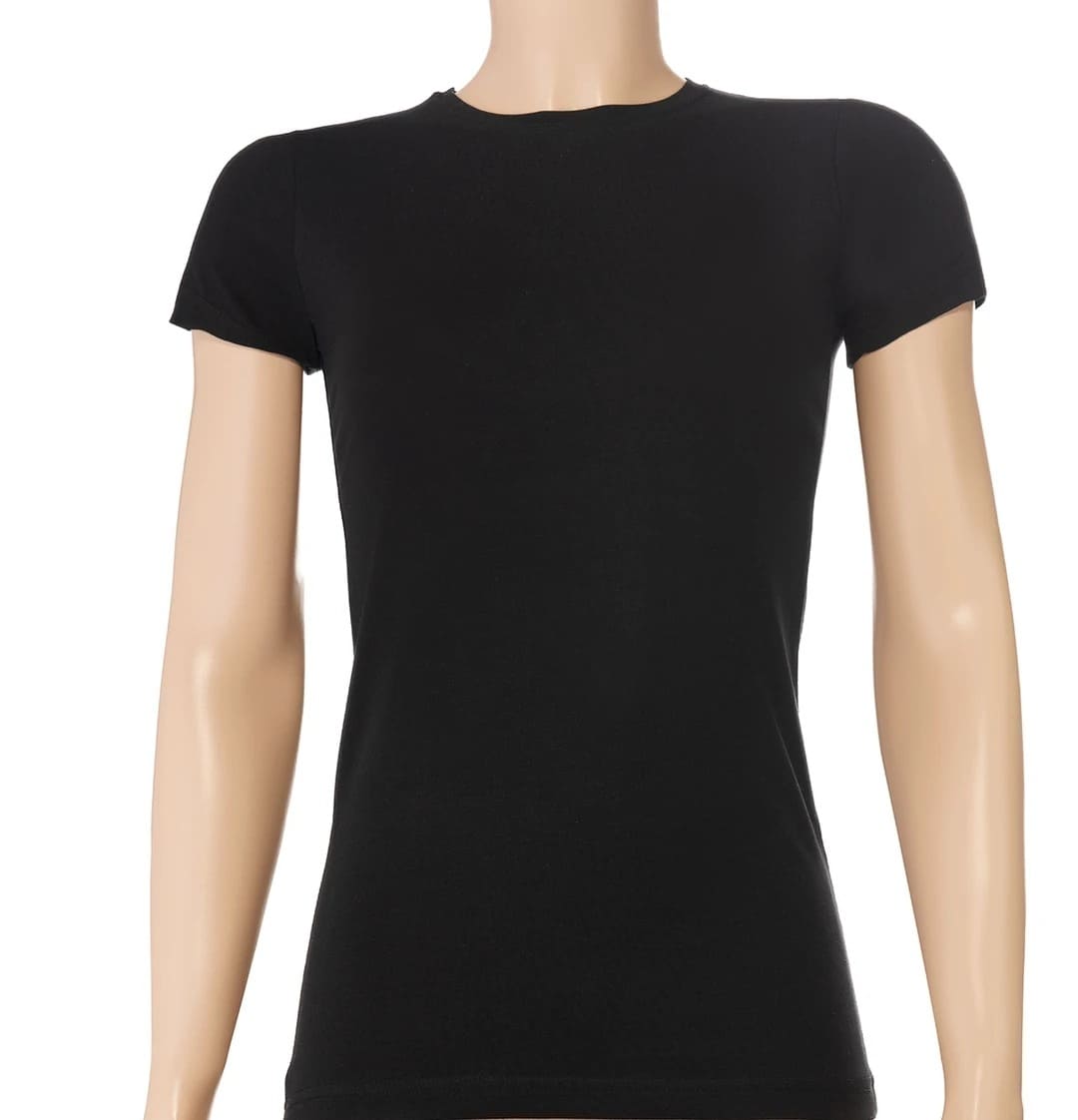 Siyah renkte, likralı kumaştan üretilmiş, kısa kollu kadın t-shirt. Uzun boy yapısı, pantolonlar içinde rahatça kullanılabilir.