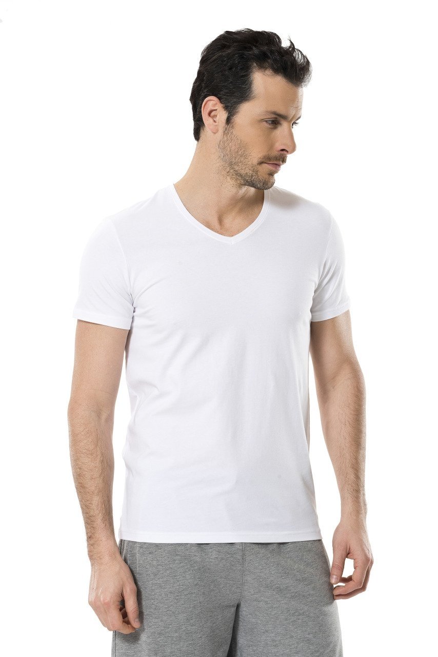 Beyaz renkte, V yaka kesimi ve likralı yapısıyla konfor sunan erkek atlet.