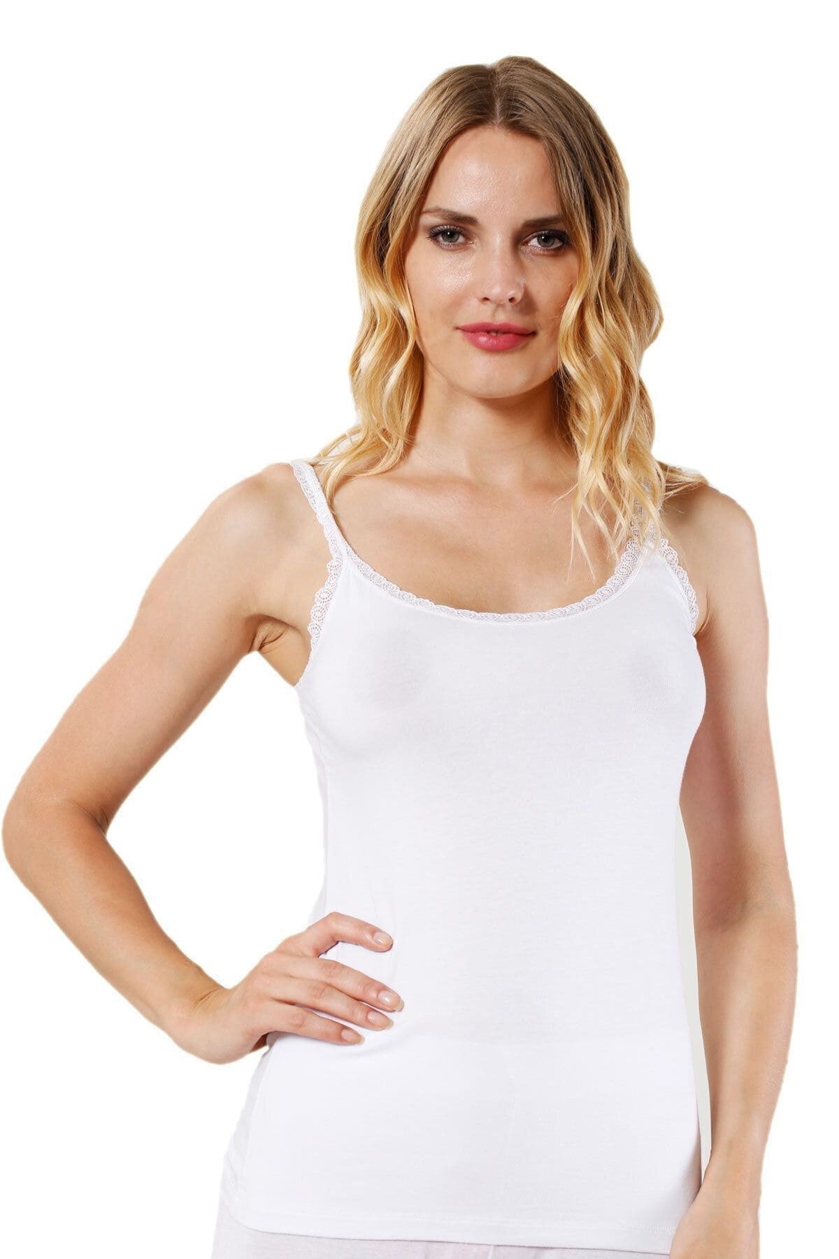 Beyaz ve somon renk seçenekleriyle, ince askılı dantelli atlet günlük kullanım için rahat bir seçenek sunar. %47 Cotton / Pamuk, %47 Modal %6 Elastane / Elastan