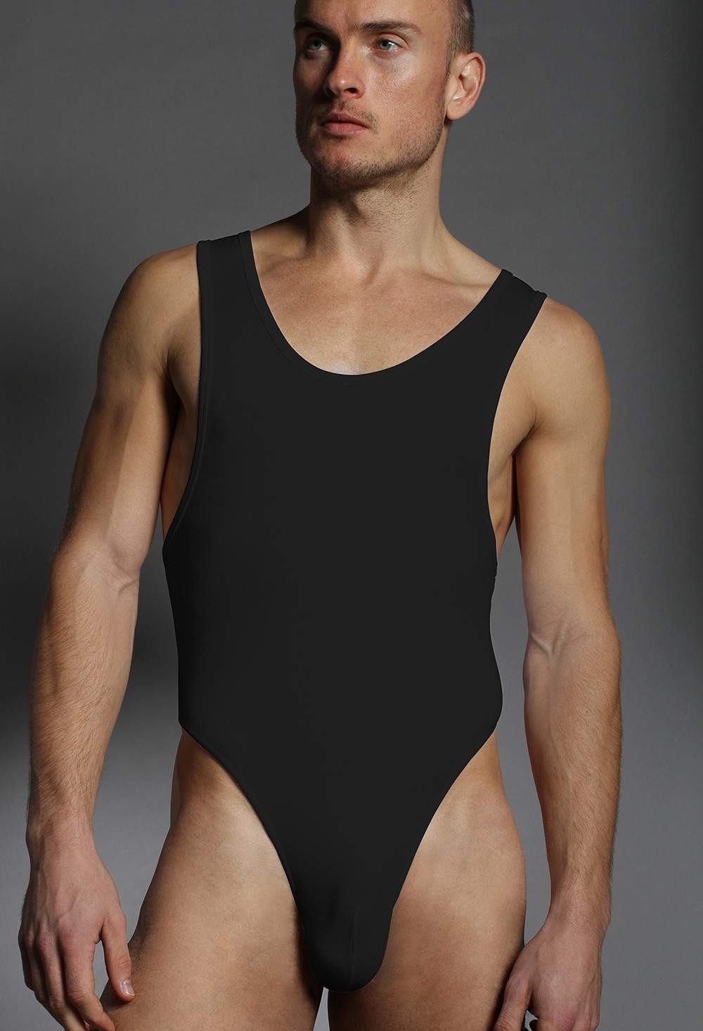 Siyah renkte, yumuşak dokulu ve vücuda oturan kesimli erkek body. %45 Modal, %45 Pamuk, %10 Elastan