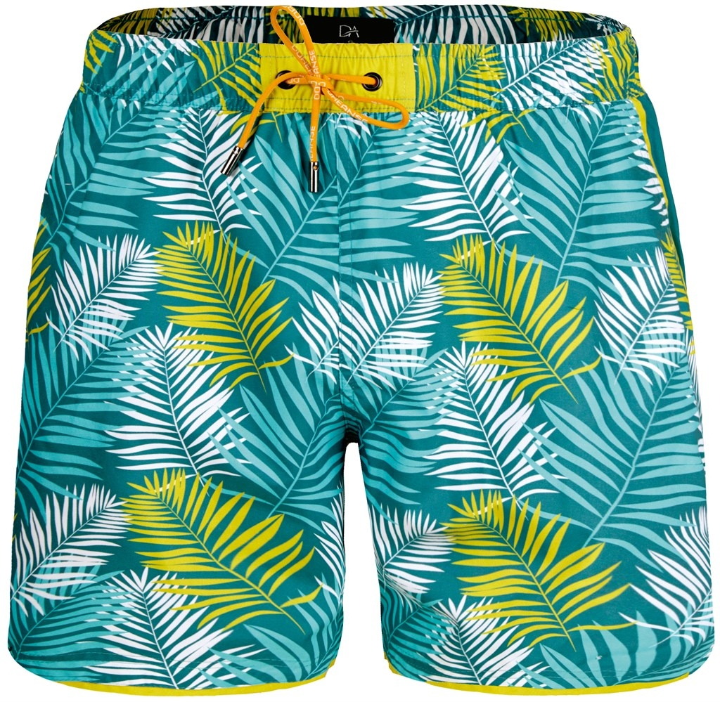 Lila tonlarında, palmiye desenli, cepli, hafif dokulu polyester mayo şortu. %100 Polyester