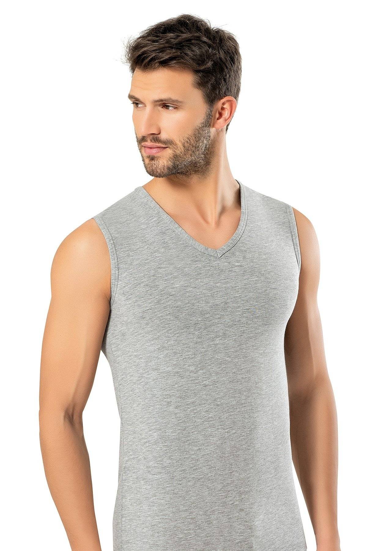 Siyah, gri ve beyaz renk seçenekleriyle, pamuk elastan karışımından üretilmiş kolsuz V yaka atlet. %92 Pamuk, %8 Elastan