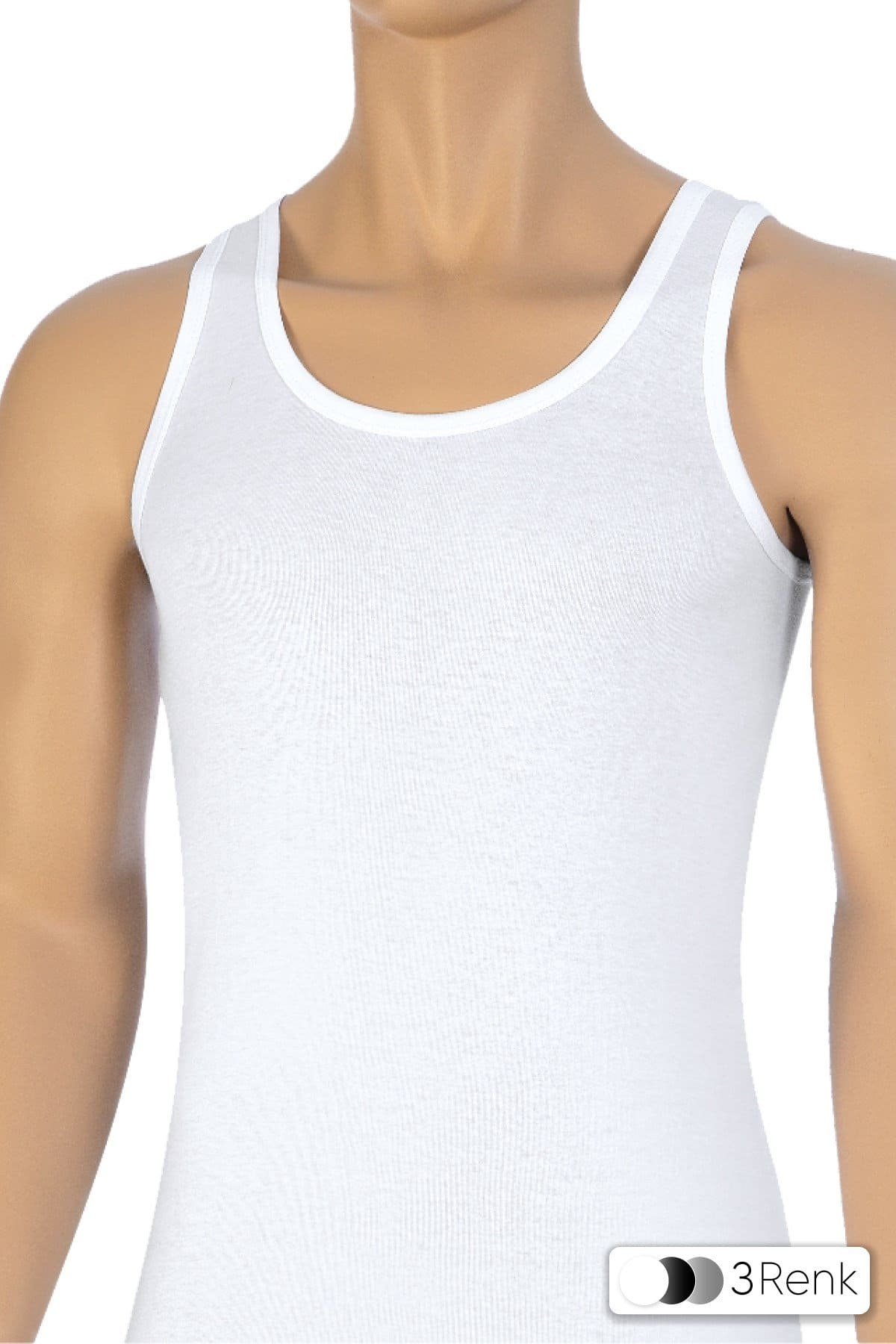 Siyah, gri ve beyaz renk seçeneklerine sahip ribana kesim pamuk erkek atlet. %100 Pamuk Ribana