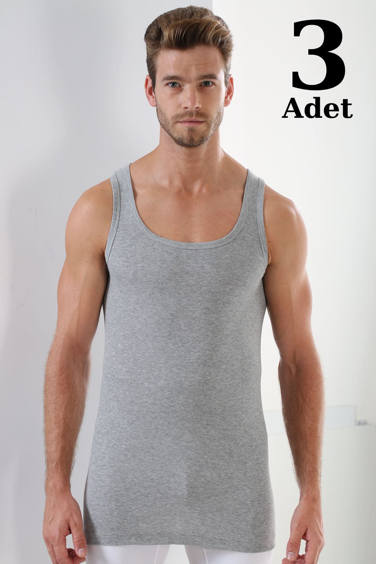 Gri tonlarında, ribana dokulu, esnek kesimli erkek atlet. Rahat ve şık bir kullanım sunar. %100 Pamuk Ribana