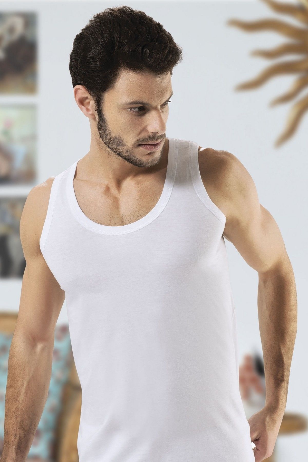 Beyaz renkte, pamuklu dokusuyla nefes alan askılı erkek atlet. %100 Pamuk