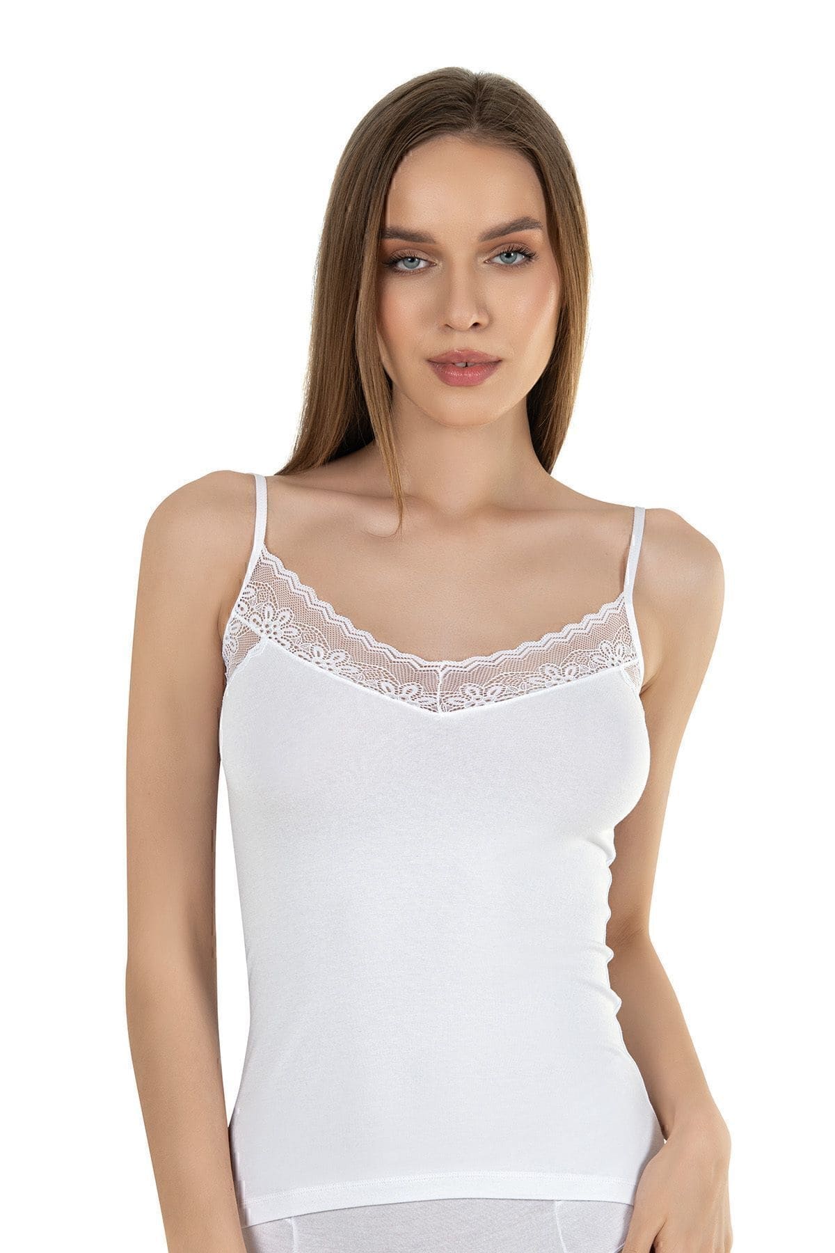 Beyaz ve somon renk seçenekleriyle sunulan, dantel detaylı ince askılı atlet, yumuşak pamuklu kumaşıyla konfor sağlıyor.