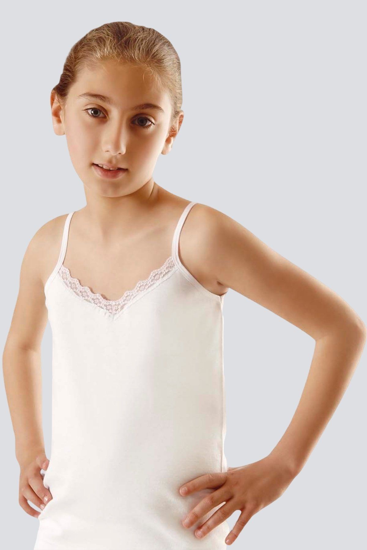 Beyaz renkte, dantelli ip askılı, yumuşak pamuk dokusuyla konforlu bir kız çocuk atlet.
