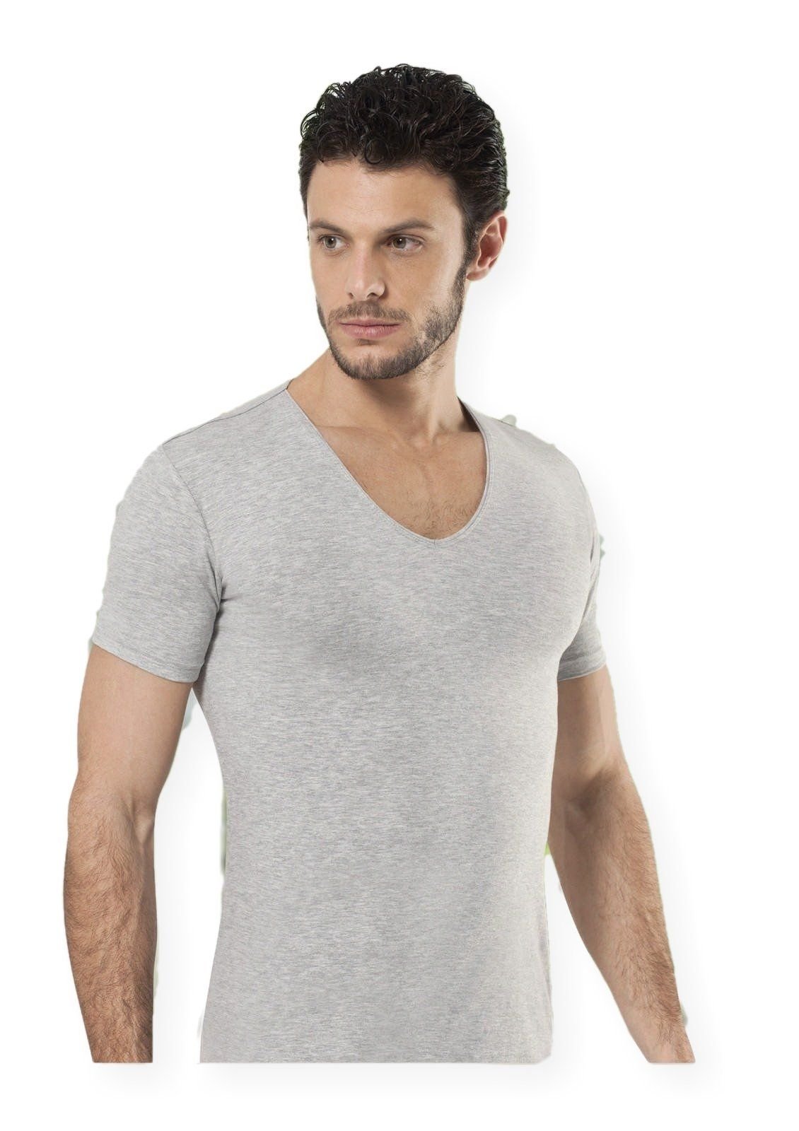 Siyah ve gri renk seçeneklerinde, derin bisiklet yaka kesimiyle şık bir görünüm sunan atlet.