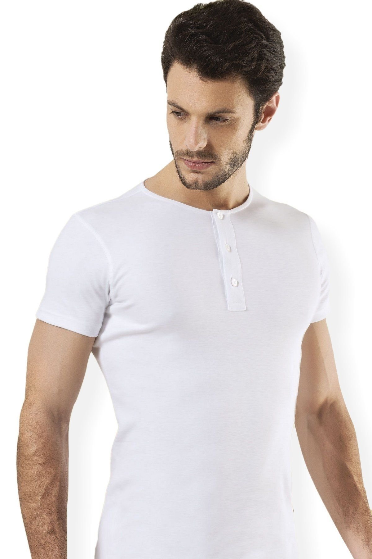 Beyaz renkte, düğmeli kollu ve pamuklu bir erkek atlet. Yumuşak doku ve hafif kesimi ile rahat bir kullanım sunar. %100 Koton