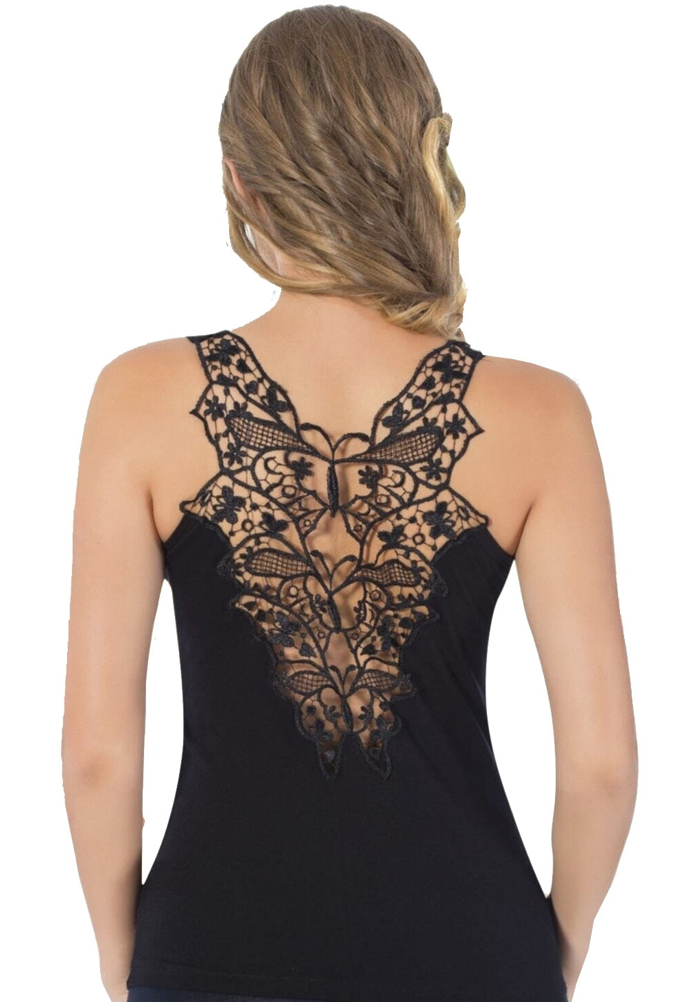 Siyah tonlarında, dantel detaylı, likralı ve ince askılı atlet. %92 Koton, %8 Elastan