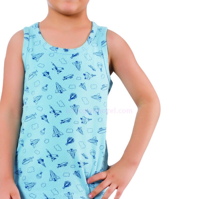 Çocuklar için tasarlanmış, mavi tonlarında metraj baskılı, hafif ve elastik kesime sahip atlet. %90 Koton, %10 Elastan