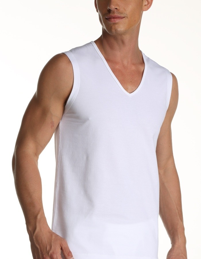 Siyah, gri ve beyaz renk seçeneklerine sahip, elastan katkılı, kolsuz V yaka atlet. %100 Pamuk