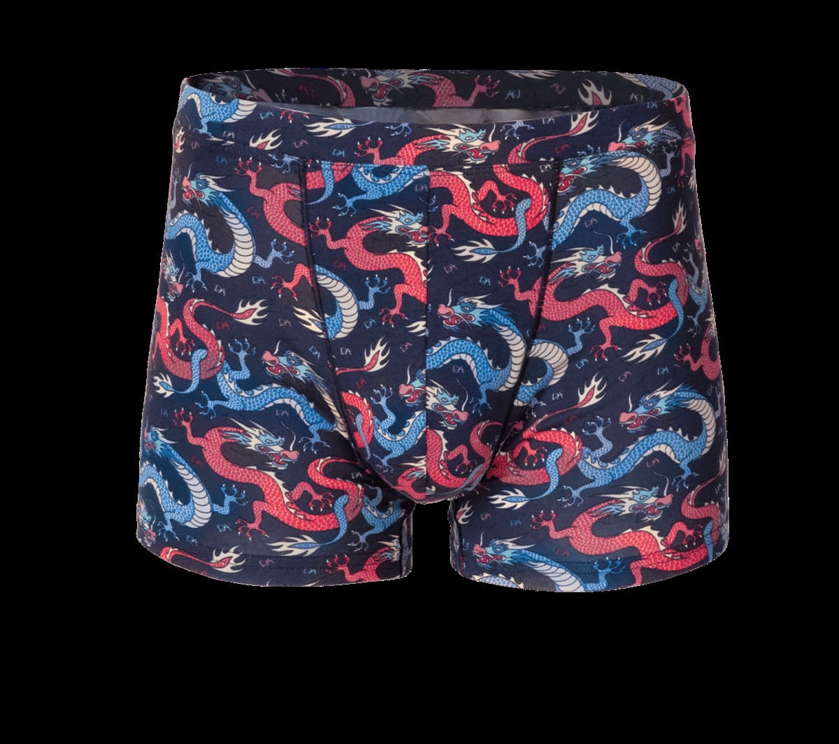 Lacivert tonlarında, renkli ejderha desenine sahip, esnek bel lastiğiyle rahat bir kesim.