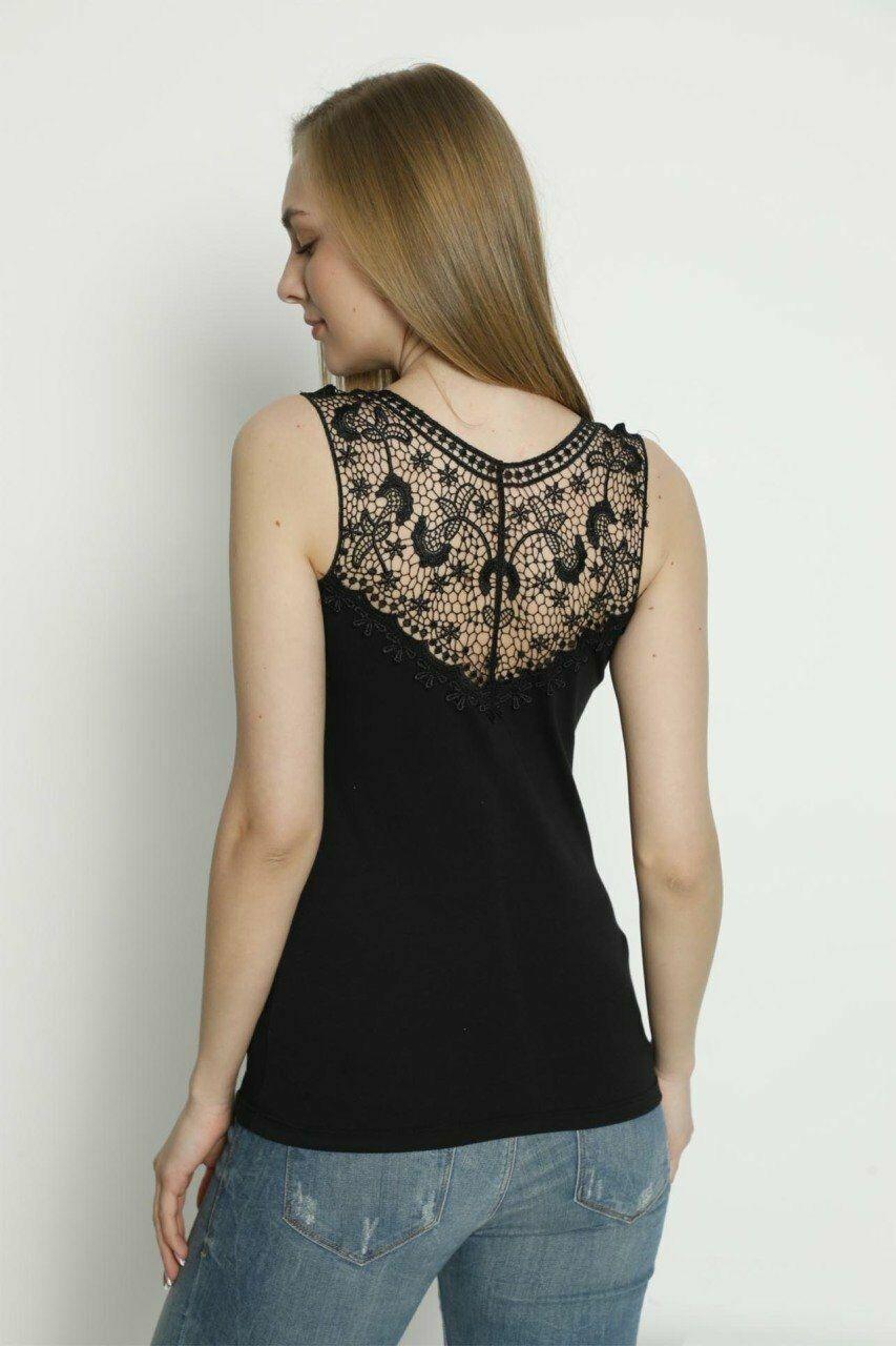 Siyah ve beyaz renk seçenekleriyle, sıfır kol ve güpür detaylı rahat bir kadın atleti.