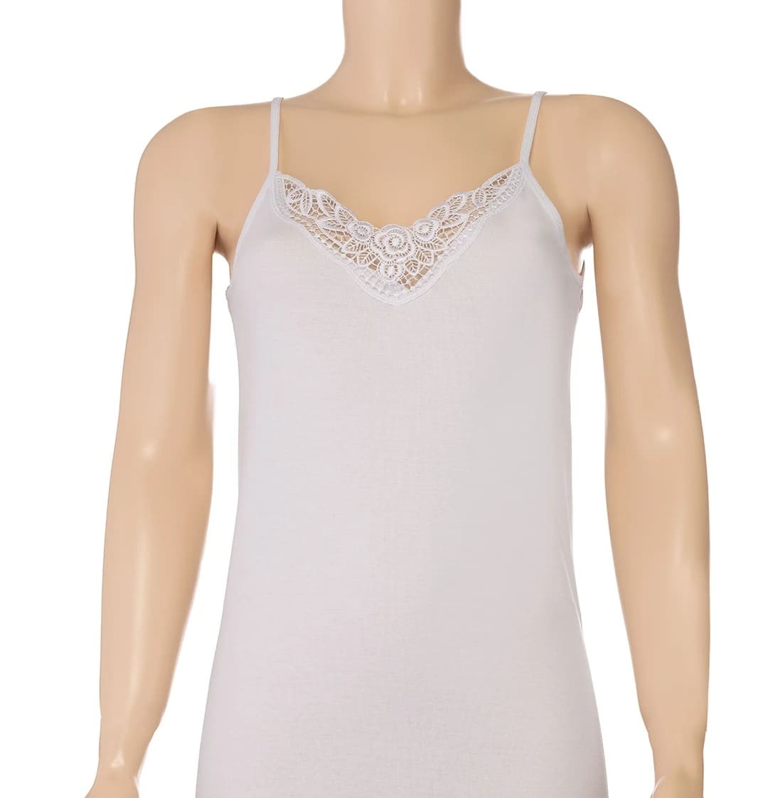 Beyaz renkte, pamuklu ve güpür detaylı ip askılı kadın atlet. İnce yapısı ve zarif kesimiyle günlük kullanım için ideal.