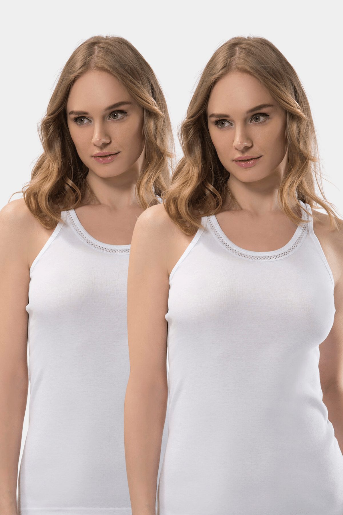 Beyaz renkte, ince askılı ve şeritli tasarıma sahip pamuklu atlet, günlük kullanım için idealdir. %100 Pamuk