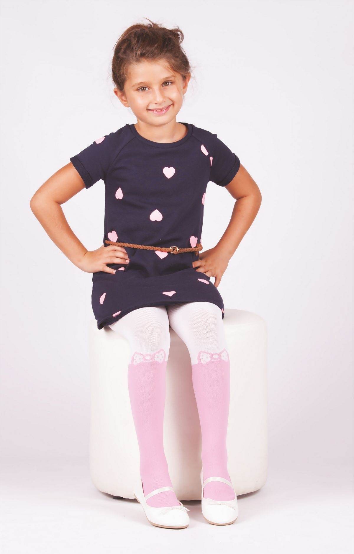 Beyaz-pembe tonlarında, pamuklu dokulu, kaydırmaz tabana sahip çocuk külotlu çorap.