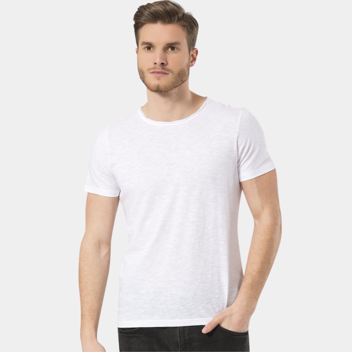 Beyaz, kısa kollu ve pamuklu bir erkek tişörtü, hafif doku ve esnek kesim ile konfor sunuyor. %100 Pamuk