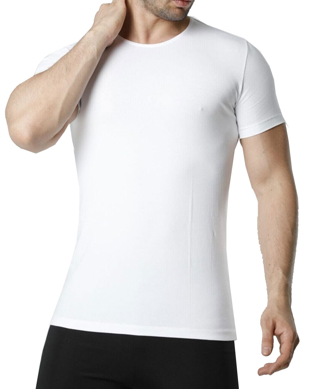 Beyaz renkte, likralı pamuk kumaş kullanılarak üretilmiş bisiklet yaka atlet. %92 Koton, %8 Elastan