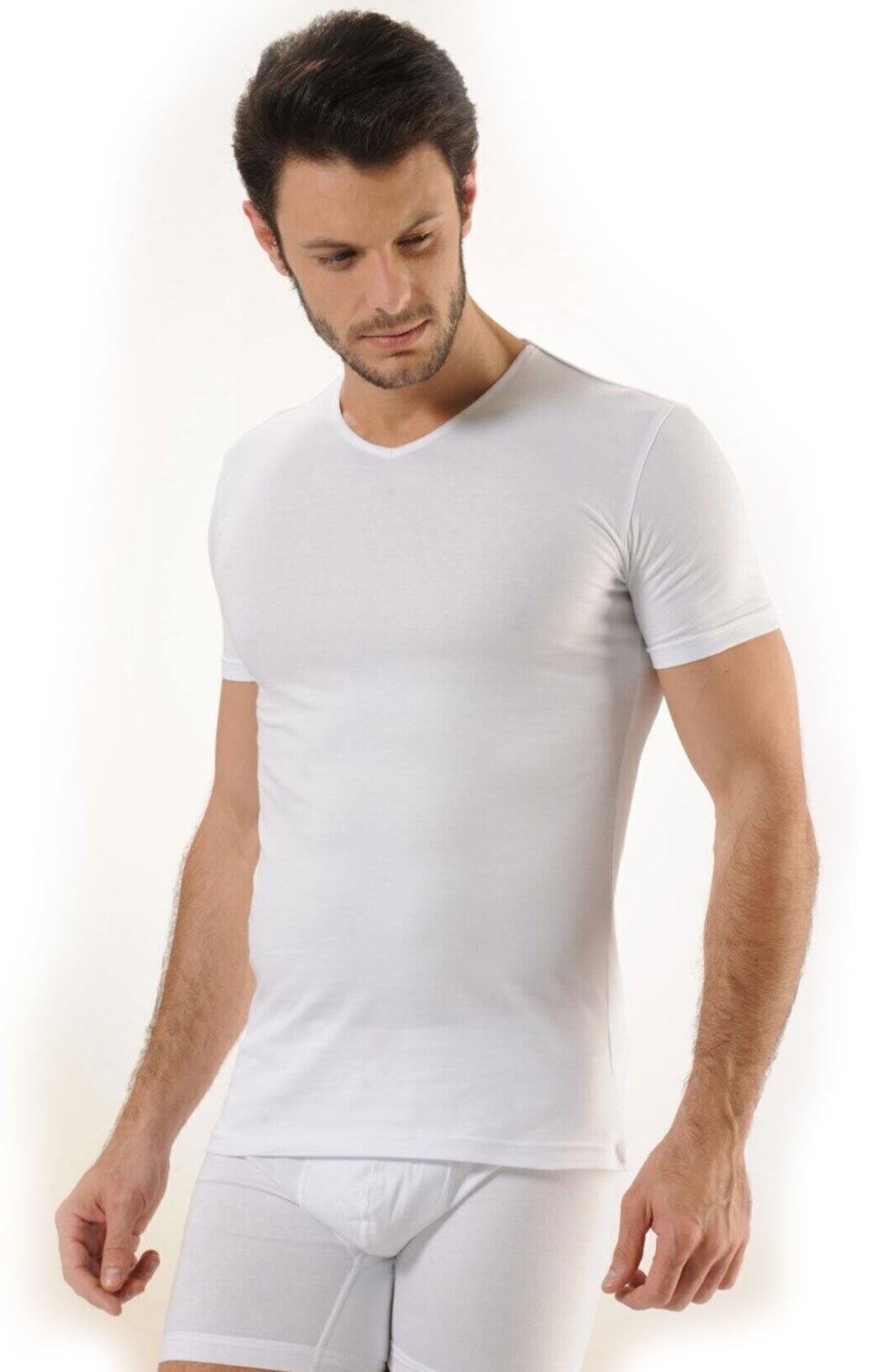 Beyaz renkli, pamuk ve elastan karışımından üretilmiş, V yaka kesim erkek atleti. %92 Koton, %8 Elastan