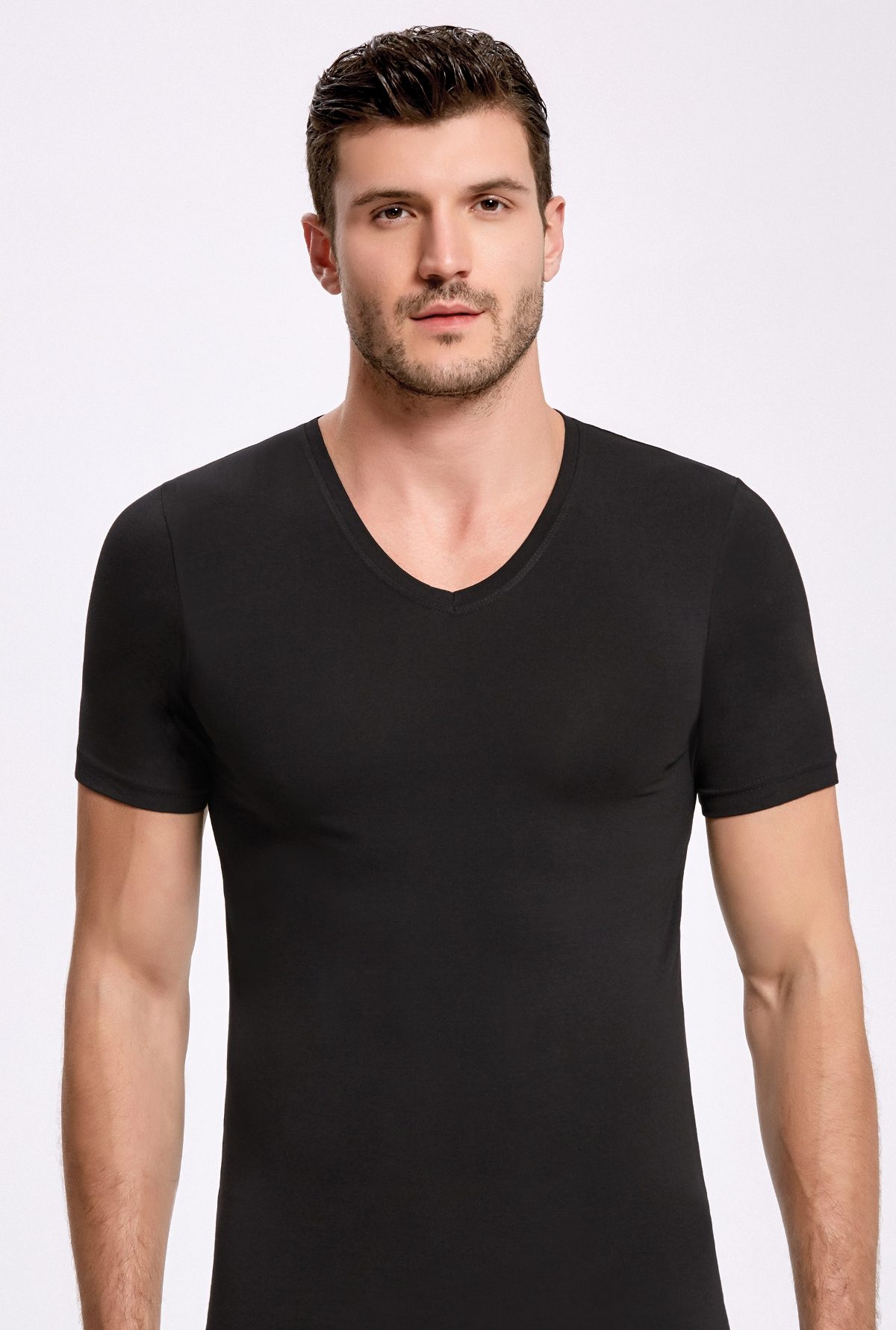 Siyah renkte, pamuk ve elastan karışımı kumaştan üretilmiş, V yakalı atlet. %92 Pamuk, %8 Elastan