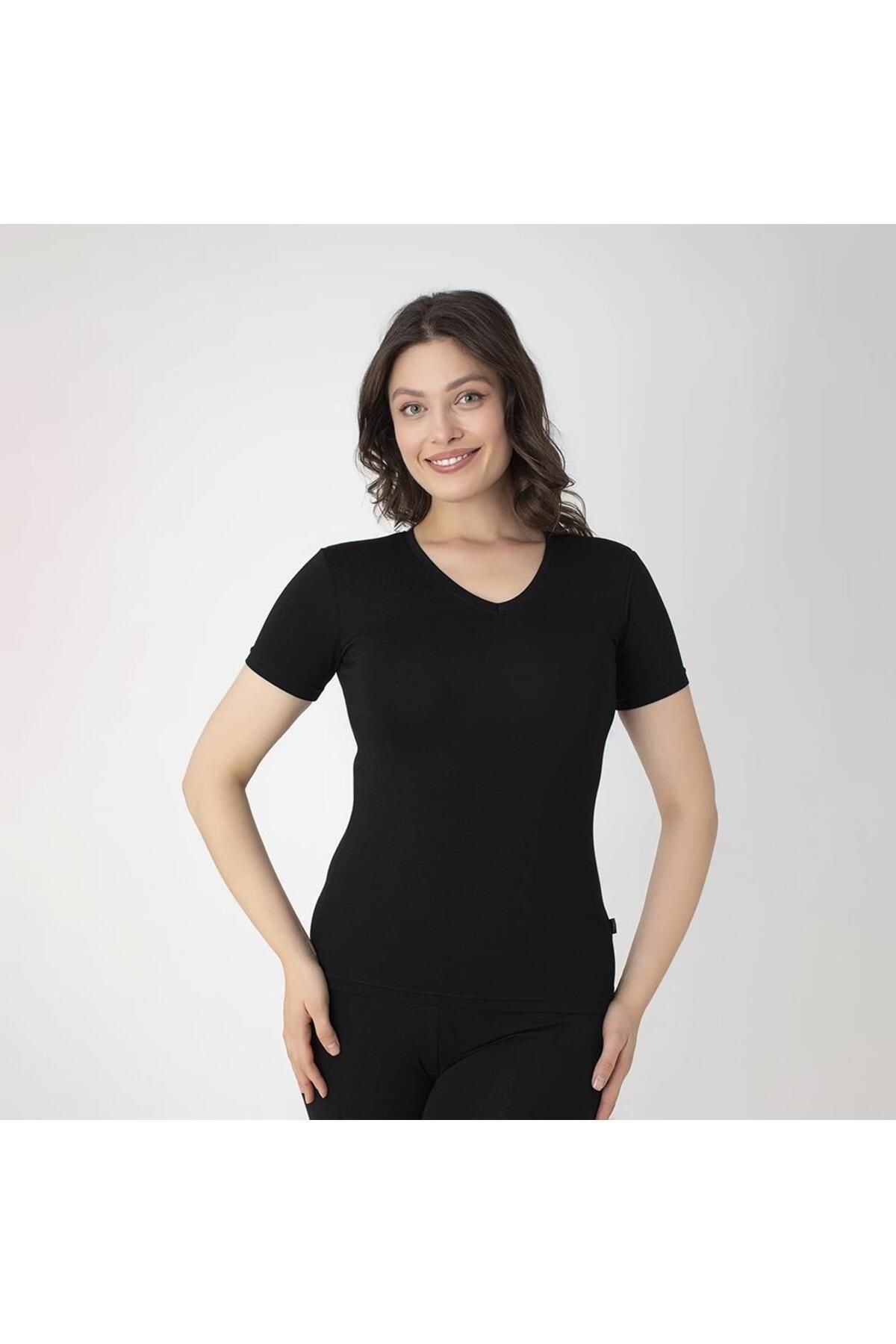 Beyaz ve somon renk seçeneklerine sahip, kısa kollu, V yaka tasarımlı modal kadın t-shirt. %45 Modal, %45 Cotton, %10 Elastane