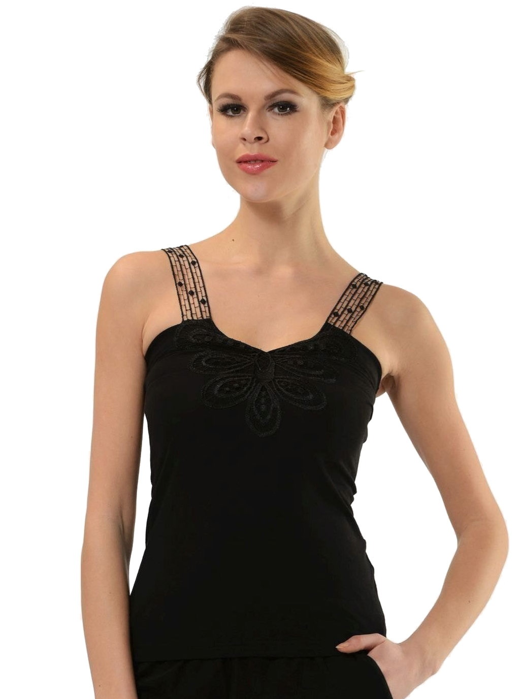 Siyah renkli, likralı süprem kumaştan üretilmiş, geniş askılı atlet. %92 Koton, %8 Elastan